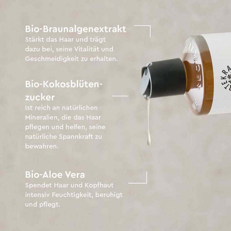 Bio-Kokosblütenzucker, mineralstoffreicher Bio-Braunalgenextrakt und beruhigender Gänseblümchenextrakt versorgen das Haar mit intensiv pflegenden Nährstoffen. Bio-Aloe Vera spendet eine Extraportion Feuchtigkeit.