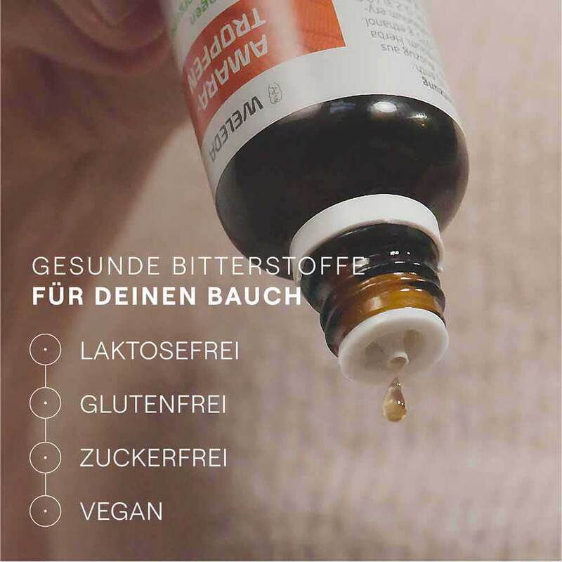 Amara-Tropfen Dilution Warnhinweis: Enthält 91 mg Alkohol (Ethanol) pro 15 Tropfen entsprechend 27 % (m/m). Anwendungsgebiete gemäß der anthroposophischen Menschen- und Naturerkenntnis. Dazu gehören: Funktionelle Störungen von Bildung und Absonderung der Verdauungssäfte; Störungen der Bewegungsabläufe von Magen und Dünndarm sowie deren Folgezustände, z.B. Sodbrennen, Appetitlosigkeit, Übelkeit, Völlegefühl nach dem Essen. Zu Risiken und Nebenwirkungen lesen Sie die Packungsbeilage und fragen Sie Ihre Ärztin, Ihren Arzt oder in Ihrer Apotheke. Weleda AG, Schwäbisch Gmünd