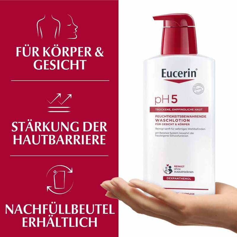 Die Eucerin pH5 Waschlotion ist ein seifenfreies, mildes Reinigungsprodukt für den Körper. Die Waschlotion eignet sich besonders für die sanfte Reinigung von Gesicht und Körper sowie für empfindliche und trockene Haut, denn diese neigt dazu, besonders auf Umweltreize mit Spannungsgefühl, Hautrötungen und Hautirritationen zu reagieren. Daher braucht strapazierte Haut eine besonders milde Reinigung, die ihre physiologische Balance aufrechterhält.
