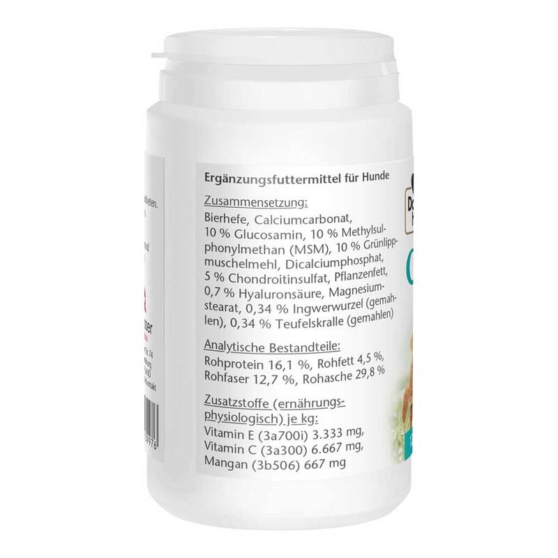 Bierhefe, Calciumcarbonat, 10 % Glucosamin, 10 % Methylsulphonylmethan (MSM), 10 % Grünlippmuschelmehl, Dicalciumphosphat, 5 %Chondroitinsulfat, Pflanzenfett, 0,7 % Hyaluronsäure, Magnesiumstearat, 0,34 % Ingwerwurzel (gemahlen), 0,34 % Teufelskralle (gemahlen)