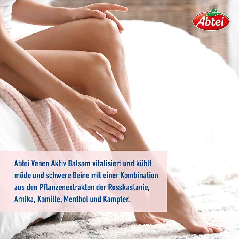 Der Abtei Venen Aktiv Balsam mit Rosskastanie kühlt, belebt und entspannt schwere Beine und sorgt für spürbare Entspannung. Der Balsam besteht aus einer speziellen Wirkstoffkombination wertvoller Pflanzenextrakte der Rosskastanie mit Arnika, Kamille, Menthol und Kampfer. Die leichte Textur zieht schnell ein ohne zu fetten - für eine erfrischende, kühlende Beinpflege mit einem angenehmen Hautgefühl.