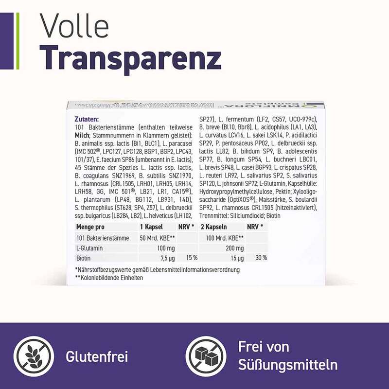 101 Bakterienstämme (enthalten teilweise Milch; Stammnummern in Klammern gelistet): B. animalis ssp. lactis (Bi1, BLC1), L. paracasei (IMC 502® , LPC127, LPC128, BGP1, BGP2, LPC43, 101/37), E. faecium SP86 (umbennant in E. lactis), 45 Stämme der Spezies L. lactis ssp. lactis, B. coagulans SNZ1969, B. subtilis SNZ1970, L. rhamnosus (CRL1505, LRH01, LRH05, LRH14, LRH58, GG, IMC 501® , LB21, LR1, CA15® ), L. plantarum (LP48, BG112, LB931, 14D), S. thermophilus (ST628, SP4, Z57), L. delbrueckii ssp. bulgaricus (LB284, LB2), L. helveticus (LH102, SP27), L. fermentum (LF2, CS57, UCO-979c), B. breve (Bl10, Bbr8), L. acidophilus (LA1, LA3), L. curvatus LCV16, L. sakei LSK14, P. acidilactici SP29, P. pentosaceus PP02, L. delbrueckii ssp. lactis LL82, B. bifidum SP9, B. adolescentis SP77, B. longum SP54, L. buchneri LBC01, L. brevis SP48, L. casei BGP93, L. crispatus SP28, L. reuteri LR92, L. salivarius SP2, S. salivarius SP120, L. johnsonii SP72; L-Glutamin, Kapselhülle: Hydroxypropylmethylcellulose, Pektin; Xylooligosaccharide (OptiXOS® ), Maisstärke, S. boulardii SP92, L. rhamnosus CRL1505 (hitzeinaktiviert), Trennmittel: Siliciumdioxid; Biotin