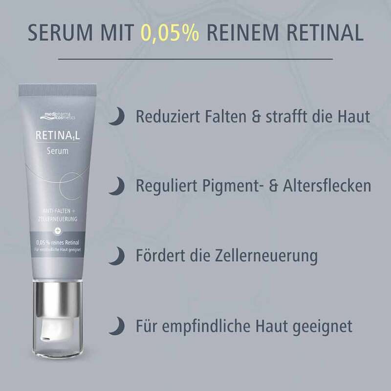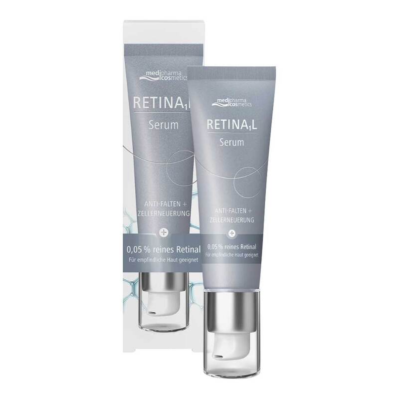 Das Serum reduziert Falten, strafft die Haut, verbessert die Hautstruktur und mindert Pigmentflecken. Das Retinal Serum mit 0,05% natürlich verkapseltem Retinal von medipharma cosmetics wurde speziell für reife Haut sowie für Hautbilder mit Hyperpigmentierung oder Unreinheiten entwickelt. Es fördert gezielt die Zellerneuerung, verbessert die Hautelastizität und unterstützt ein ebenmäßiges, verfeinertes Hautbild.