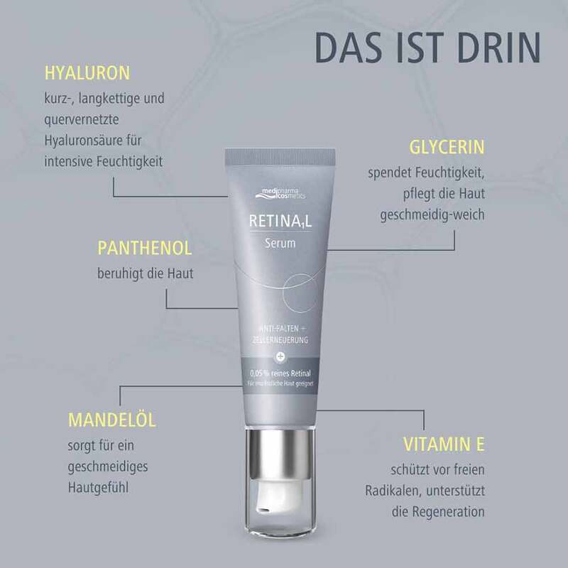 Retinal ist die direkte Vorstufe der Retinsäure, wodurch nur ein einziger Umwandlungsschritt notwendig ist. Retinalhaltige Produkte gelten aufgrund der schnellen & effektiven Umwandlung zu Retinsäure als besonders wirksam und dienen in der Kosmetik insbesondere zur Verbesserung der Hautstruktur, sowie zur Minderung Faltentiefe.