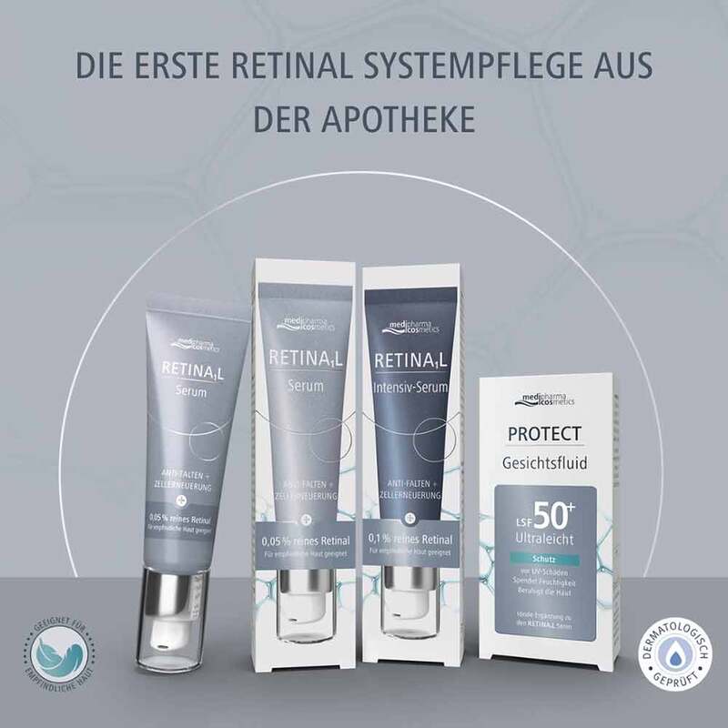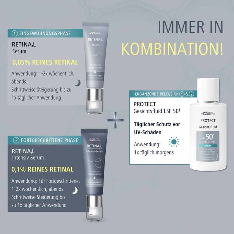 Dieses Serum bildet den Einstieg in die dermatologisch abgestimmte Retinal-Systempflege von medipharma cosmetics. Es wurde für die Einstiegsphase der Retinal-Anwendung konzipiert – mit 0,05 % Retinal als Konzentration, die sich besonders für den Beginn einer regelmäßigen Pflege eignet. Nach der Eingewöhnungsphase kann bei Bedarf auf das stärker konzentrierte Retinal Intensiv Serum mit 0,1% reinem, natürlich verkapseltem Retinal umgestellt werden.