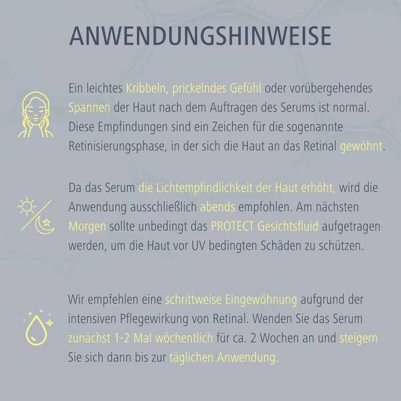 Da Retinal die Lichtempfindlichkeit erhöht, ist eine ausschließliche Anwendung am Abend erforderlich. Ein geeigneter Lichtschutz am Morgen – am Besten das Protect Gesichtsfluid – ist unverzichtbar, um die Haut vor UV bedingten Schäden zu schützen.