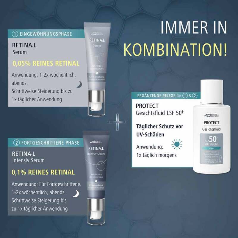 Die Anwendung erfolgt abends, zunächst ein- bis zweimal pro Woche. Sobald sich die Haut an das stärker konzentrierte Retinal gewöhnt hat, kann die Anwendung schrittweise bis zu einer täglichen Abendroutine gesteigert werden. Da Retinal die Lichtempfindlichkeit der Haut erhöht, ist ein ergänzender Lichtschutz am Morgen – empfehlungsweise mit dem Protect Gesichtsfluid – unverzichtbar, um die Haut vor UV bedingten Schäden zu schützen.