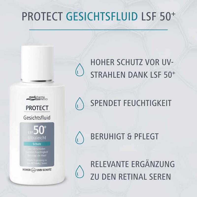 Das Protect Gesichtsfluid LSF 50+ von medipharma cosmetics schützt die Haut zuverlässig vor UV-Schäden und ist die ideale Ergänzung zu den medipharma Retinal Seren. Das Gesichtsfluid mit sehr hohem Lichtschutzfaktor spielt eine wichtige Rolle beim Schutz der Haut am nächsten Morgen.