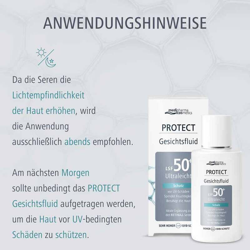 Retinal kann die Lichtempfindlichkeit der Haut erhöhen, was bedeutet, dass die Haut nach der Anwendung besonders anfällig für UV-Schäden ist. Um die optimale Wirkung der Retinal Seren zu gewährleisten und gleichzeitig die Haut vor den schädlichen Auswirkungen der Sonnenstrahlung zu schützen, ist der tägliche Gebrauch des Protect Gesichtsfluids unerlässlich. Hierfür sollten die Seren ausschließlich am Abend aufgetragen und das Gesichtsfluid am nächsten Morgen angewandt werden.