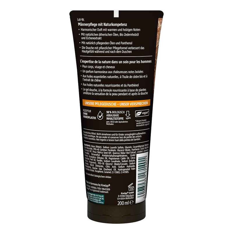 Die Kneipp Men 3in1 Pflegedusche kraftvoll ist mit natürlichen ätherischen Ölen, Bio Zedernholzöl und Eichenextrakt. Es entfaltet schon beim Duschen einen harmonischen Duft mit warmen und holzigen Noten. Das Duschgel bewahrt die natürliche Hautfeuchtigkeit über 24h und verbessert das Hautgefühl während und nach dem Duschen. Es eignet sich für Haut, Haar und Gesicht.