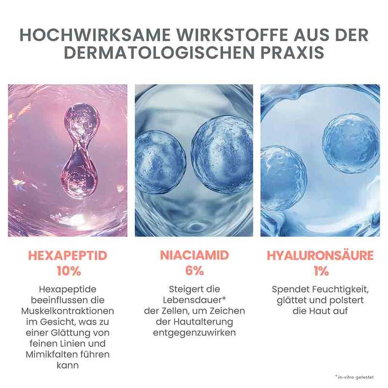 Die glättende Anti-Falten-Wirkung mit Lifting-Effekt basiert auf einem Trio von in der ästhetischen Medizin anerkannten Aktivstoffen, die in reiner und konzentrierter Form angeboten werden: