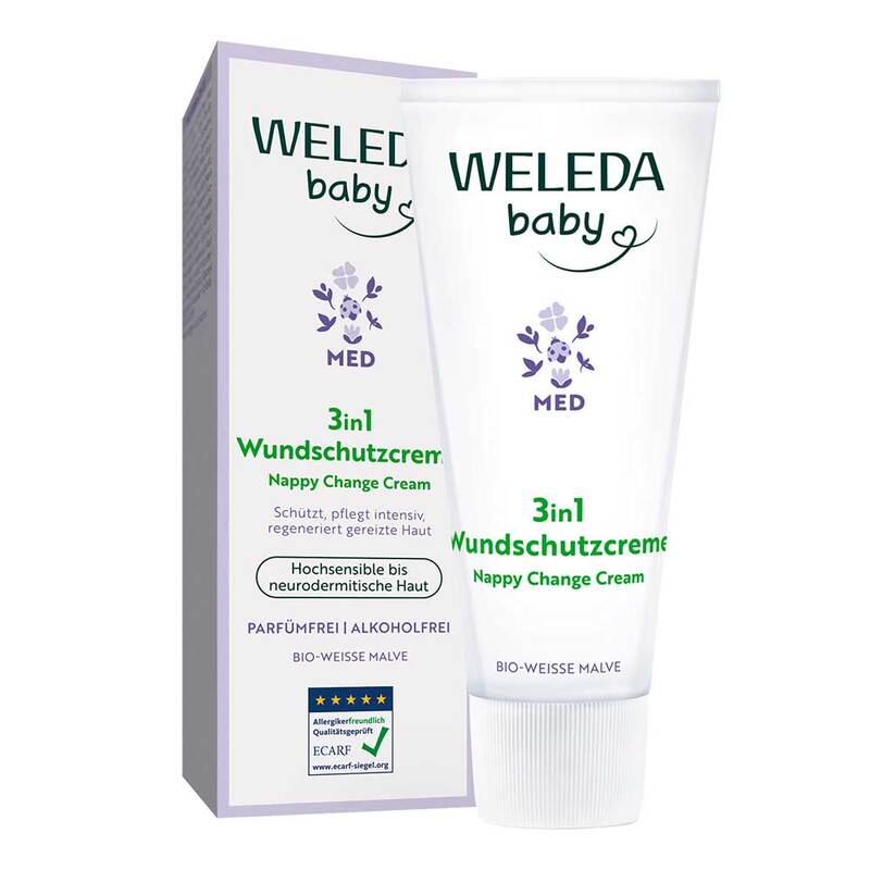 Schützen Sie die zarte Haut Ihres Babys vor dem Wundsein im Windelbereich mit der Med 3in1 Wundschutzcreme von Weleda Baby! Ihre Formel mit Bio-Weisse Malve, Bio-Nachtkerzenöl und Mondo Graswurzelextrakt eignet sich ideal zur Pflege von hochsensibler bis neurodermitischer Haut. Sie beruhigt die Haut im Windelbereich, mindert Rötungen und Irritationen nach der ersten Anwendung. Gleichzeitig unterstützt die Wundschutzcreme die normale Hautfunktion und die Regeneration der Haut.