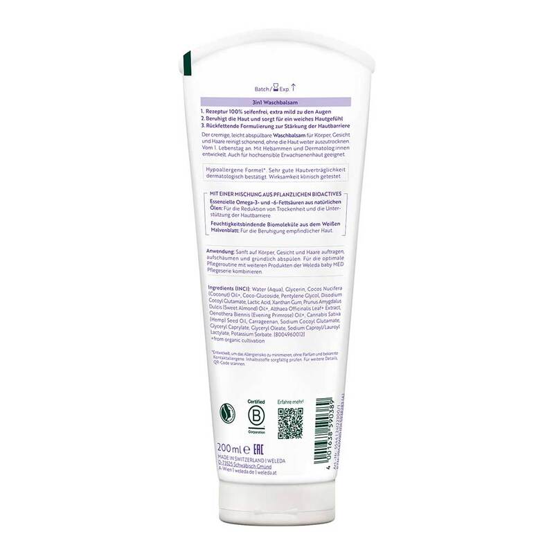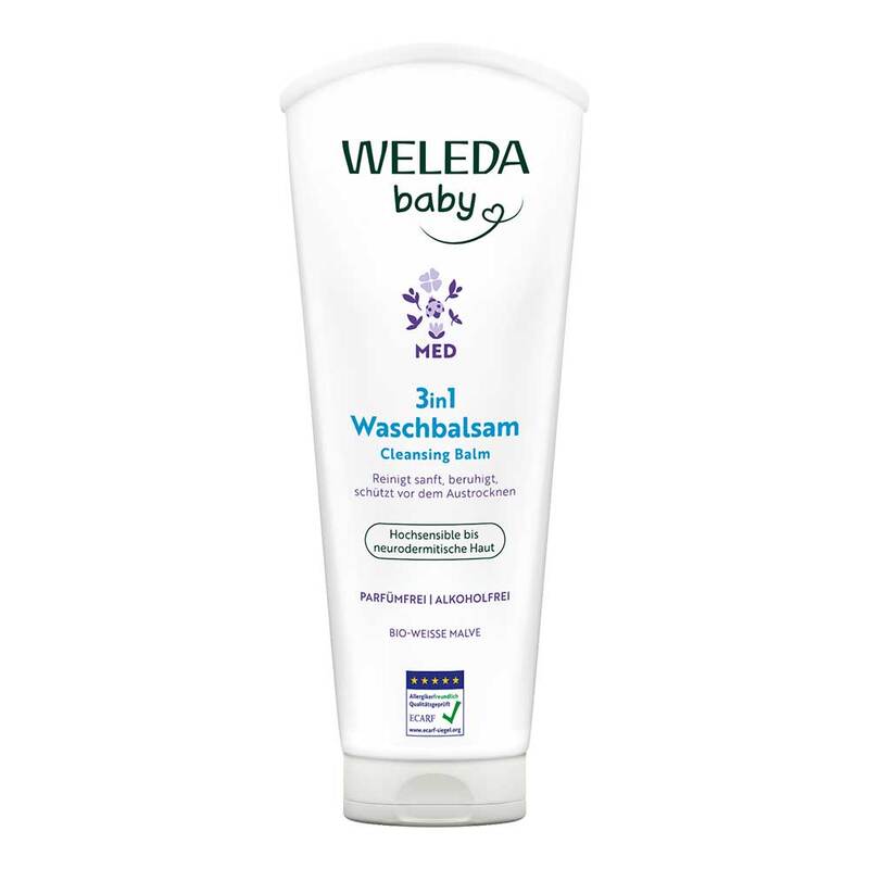 Reinigen Sie die hochsensible bis neurodermitische Haut Ihres Babys mit dem Med 3in1 Waschbalsam Weiße Malve von Weleda Baby! Seine seifenfreie Formel mit Weisser Bio-Malve, Bio-Nachtkerzenöl und Extrakt aus Mondo Graswurzel reinigt die Haut besonders sanft, ohne auszutrocknen. Gleichzeitig versorgt der Waschbalsam die Haut mit wertvollen Lipiden und wirkt somit rückfettend. Die Haut wird beruhigt und die Hautbarriere gestärkt.