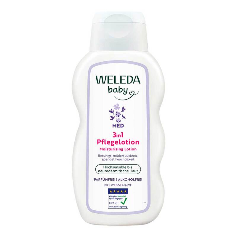 Schenken Sie der hochsensiblen bis neurodermitischen Haut Ihres Babys mit der Med 3in1 Pflegelotion weiße Malve von Weleda Baby verwöhnende Feuchtigkeit! Ihre Formel mit wertvollen Inhaltsstoffen wie Bio-Weisse Malve, Bio-Nachtkerzenöl und Extrakt aus Mondo Graswurzel beruhigt die Haut, schützt und stärkt die Hautbarriere. Gleichzeitig reduziert sie Rötungen und mindert Juckreiz. Die Pflegelotion zieht schnell ein und klebt nicht.