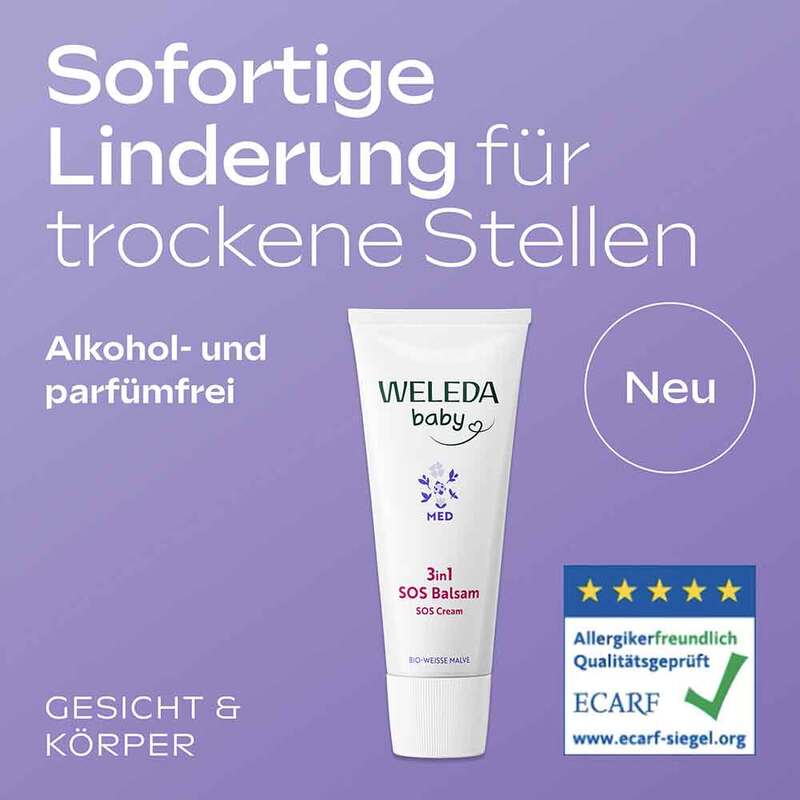 Der Derma 3in1 SOS Balsam Weisse Malve von Weleda Baby ist eine sofort wirksame Pflege bei hochsensibler und sehr trockener Babyhaut. Seine intensiv pflegende Formel mit Bio-Weisse Malve, Bio-Nachtkerzenöl und Mondo Graswurzel beruhigt direkt nach der ersten Anwendung und schenkt sofortige Feuchtigkeit - bis zu 24 Stunden. Die Hautbarriere wird geschützt und gestärkt. Trockene und irritierte Stellen werden wieder zart und geschmeidig.