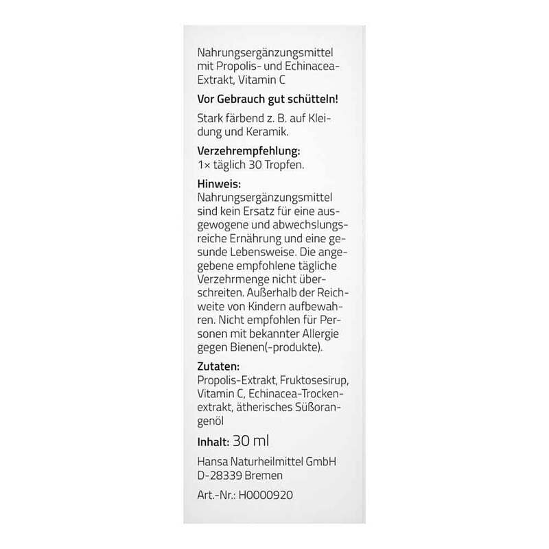 Propolis-Extrakt, Fruktosesirup, Vitamin C, Echinacea-Trockenextrakt, ätherisches Süßorangenöl