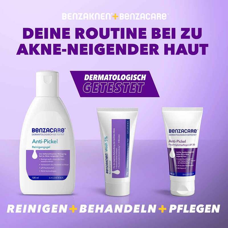 - Schritt 1: Benzacare Anti-Pickel Reinigungsgel dient der täglichen Reinigung von unreiner und zu Akne neigender Haut. Es trocknet die Haut nicht aus und bereitet sie optimal für die Behandlung mit Benzaknen vor.
