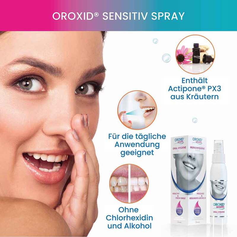 OROXID® sensitiv Mundspray ist ein innovatives, patentiertes Medizinprodukt auf der Basis von Aktivsauerstoff. Es dient der Erhaltung eines gesunden Zahnfleisches und hilft bei Entzündungen in der Mundhöhle. Die Einzigartigkeit der Produkte liegt in ihrem neuartigen Wirkmechanismus, der die Mundhöhle mit Sauerstoff versorgt, regeneriert und desinfiziert.