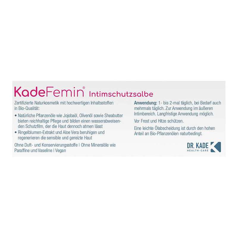 Die KadeFemin Intimschutzsalbe ist eine zertifizierte Naturkosmetik für den äußeren Intimbereich mit natürlichen Bio-Pflanzenölen – entwickelt speziell für die Pflegebedürfnisse empfindlicher, reifer oder hormonell belasteter Haut. Sie schützt vor Reizungen, stabilisiert die Hautbarriere und spendet sanfte Pflege bei Trockenheit, Reibung oder Feuchtigkeit.