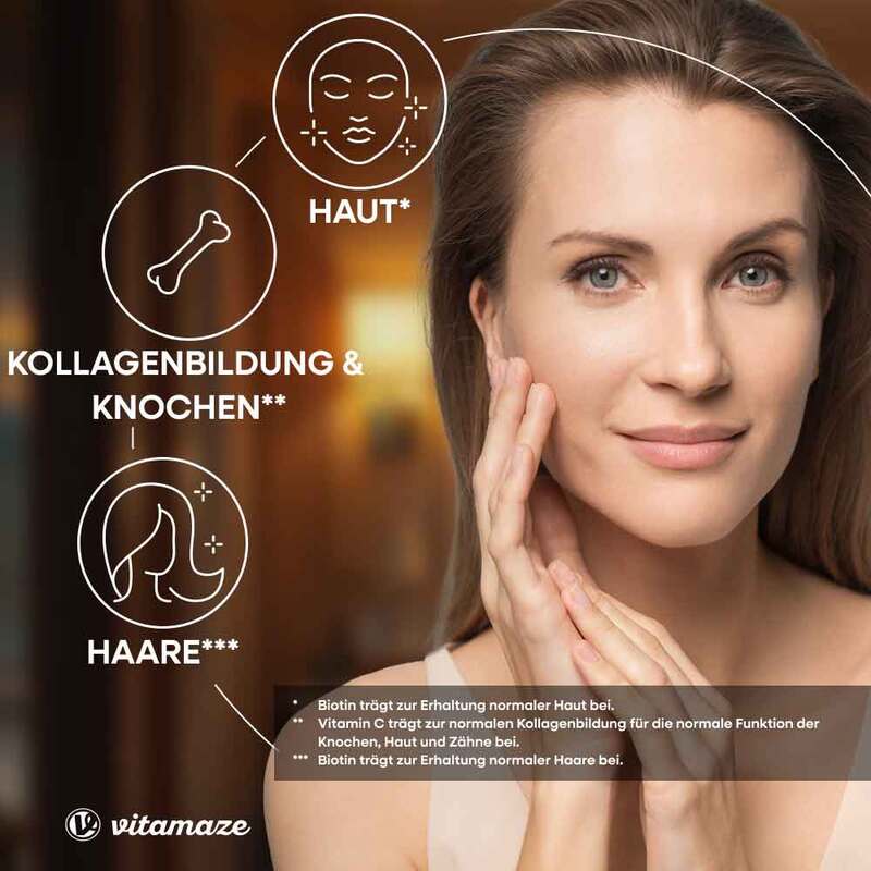 * Biotin trägt zur Erhaltung normaler Haare bei, Biotin trägt zur Erhaltung normaler Haut bei, Vitamin C trägt zu einer normalen Kollagenbildung für eine normale Funktion der Blutgefäße bei, Vitamin C trägt zu einer normalen Kollagenbildung für eine normale Funktion der Knochen, Vitamin C trägt zu einer normalen Kollagenbildung für eine normale Knorpelfunktion bei, Vitamin C trägt zu einer normalen Kollagenbildung für eine normale Funktion des Zahnfleisches bei, Vitamin C trägt zu einer normalen Kollagenbildung für eine normale Funktion der Haut bei, Vitamin C trägt zu einer normalen Kollagenbildung für eine normale Funktion der Zähne bei, Vitamin C trägt zu einer normalen Funktion des Immunsystems bei, Vitamin C trägt dazu bei, die Zellen vor oxidativem Stress zu schützen.