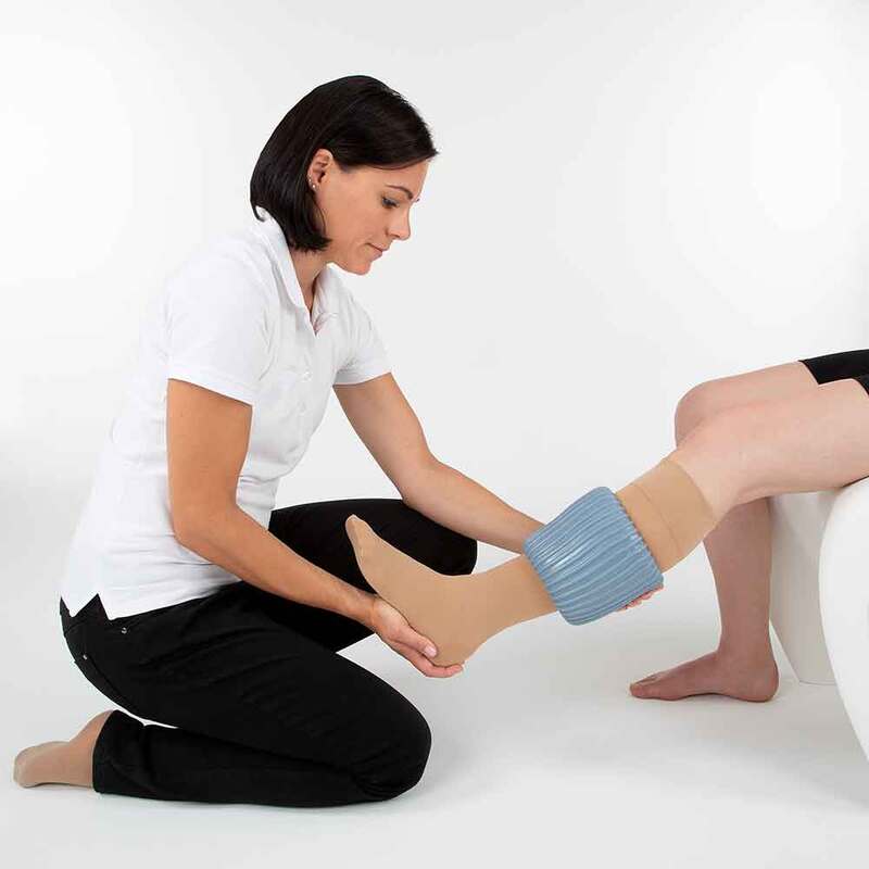 • Lässt Kompressionsstrümpfe schmerzfrei über Wunden, Narben und offene Beine gleiten