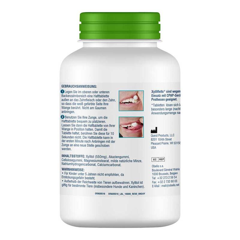 Bei Xylimelts handelt es sich um eine mit einer Haftoberfläche versehenen Tablette. Mit der Haftseite klebt die Tablette am Gaumen fest und gibt ihre Wirkstoffe Xylit und Calciumcarbonat ab, die durch Anregung des Speichelflusses Mundtrockenheit verhindern bzw. lindern.