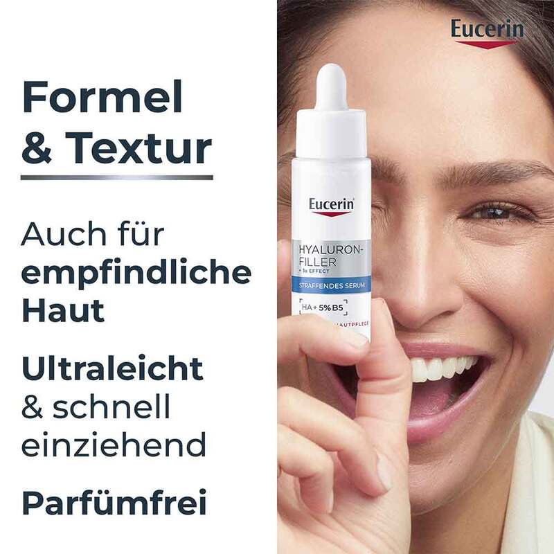 Das Eucerin Hyaluron-Filler + 3x Effect Sstraffendes Serum 30 ml mit hochkonzentrierter Hyaluronsäure, Glycerin und Provitamin B5 polstert die Haut auf, spendet intensive Feuchtigkeit und stärkt die Hautbarriere. Parfümfrei und schnell einziehend verleiht das erfrischende Anti Age Feuchtigkeitsgel ein langanhaltend angenehmes Hautgefühl.