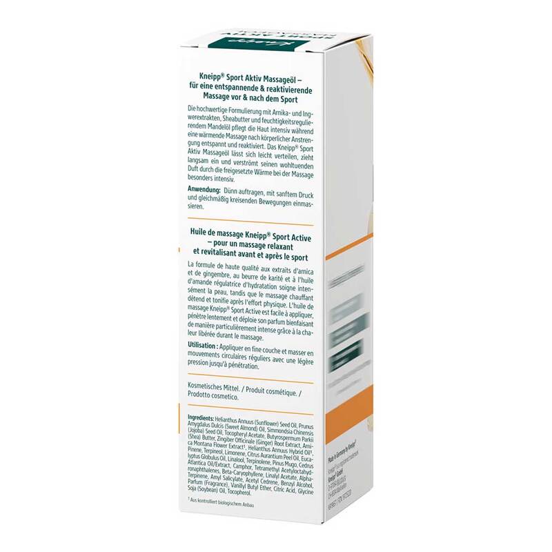 Das Kneipp Sport Aktiv Massageöl lässt sich leicht verteilen, zieht langsam ein und verströmt seinen aromatischen Duft durch die freigesetzte Wärme bei der Massage besonders intensiv.