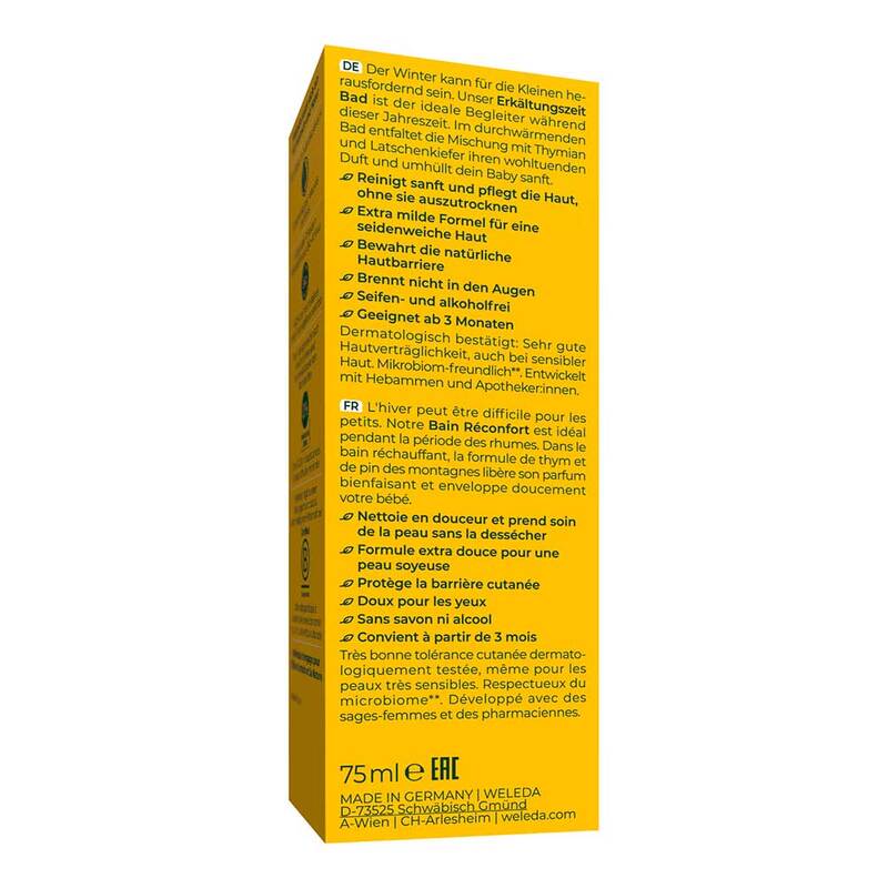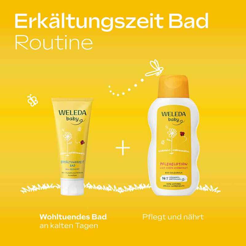 Schenken Sie Ihrem Baby in der kälteren Jahreszeit wohlige Geborgenheit mit dem Calendula Erkältungszeit Bad von Weleda Baby! Das Baden mit dem Erkältungszeit Bad entspannt und pflegt die Haut – seine extra milde Formel reinigt die Haut besonders sanft. Im durchwärmenden Bad entfaltet die Mischung mit Thymian, Latschenkiefer und Lavendel ihren angenehmen Duft. Das Bad ist geeignet für Babys ab 3 Monaten.