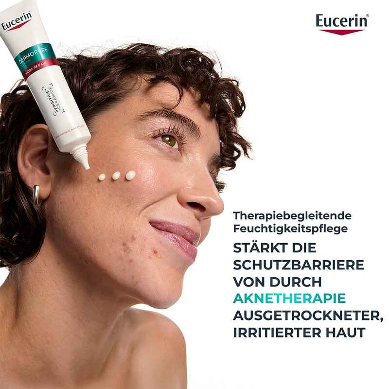 Die Eucerin® DERMOPURE CLINICAL Hydra Repair Therapiebegleitende Feuchtigkeitspflege 40 ml ist eine Gesichtspflege speziell für Menschen, die sich aufgrund unreiner Haut und Akne in medikamentöser Behandlung befinden. Infolge dieser Aknetherapie kann die Haut sehr trocken werden und auch gerötet oder irritiert reagieren. Die Gesichtscreme mildert diese Nebenwirkungen mit einer effektiven Wirkstoffkombination aus SymSITIVE* und Ceramiden. Sie stellt die ausgetrocknete Schutzbarriere der Haut wieder her, mildert Hautirritationen und reduziert Spannungen sowie Rötungen.