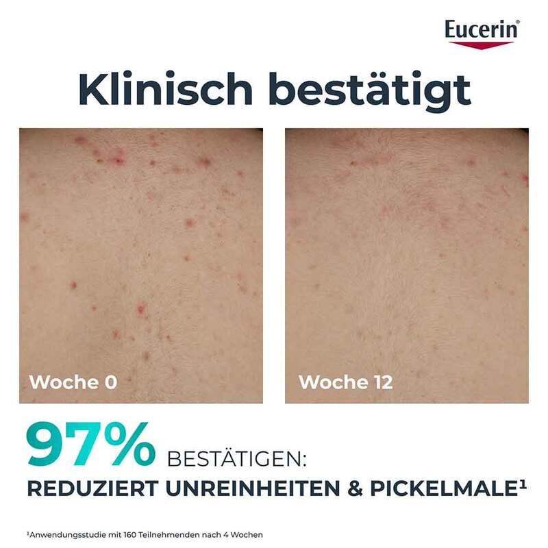 Die Eucerin® DERMOPURE CLINICAL Erneuernde Körperpflege reduziert Unreinheiten und Pickelmale am Körper in nur 2 Wochen*. Die einzigartige Formel kombiniert die aktiven Wirkstoffe Salicylsäure (BHA), Thiamidol® sowie Squalane für ein reineres Hautbild. Zudem wird die Haut bis zu 48h mit Feuchtigkeit versorgt.