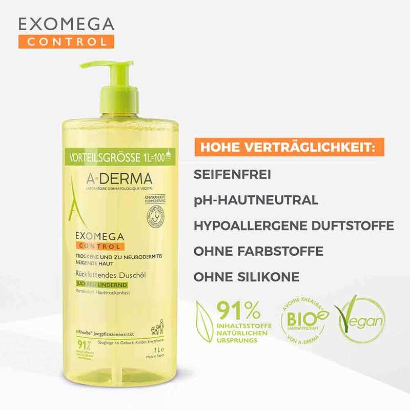 Das EXOMEGA Control Duschöl ist ein rutschfestes Reinigungsöl, welches sanft schäumt und sich leicht abspülen lässt. Es ist seifenfrei, brennt nicht in den Augen und ist daher sehr gut für Kinder geeignet.
