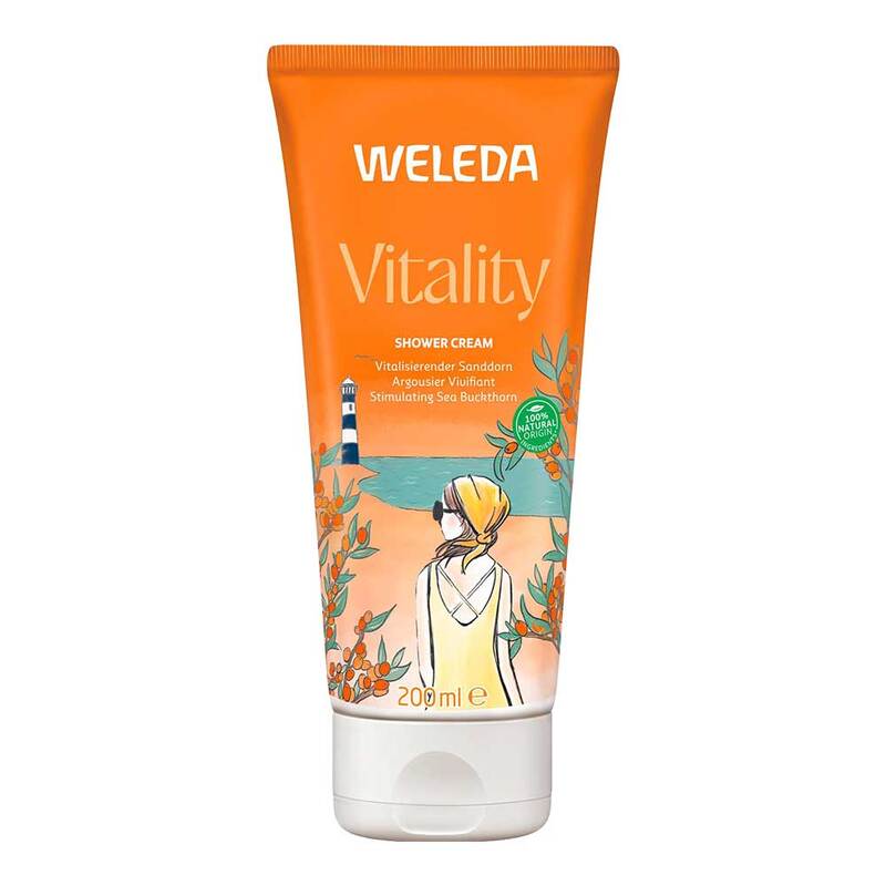 Die Weleda Vitality Cremedusche enthält stimulierenden Sanddorn. Sie verfügt über einen anregenden Duft, der die Sinne belebt.