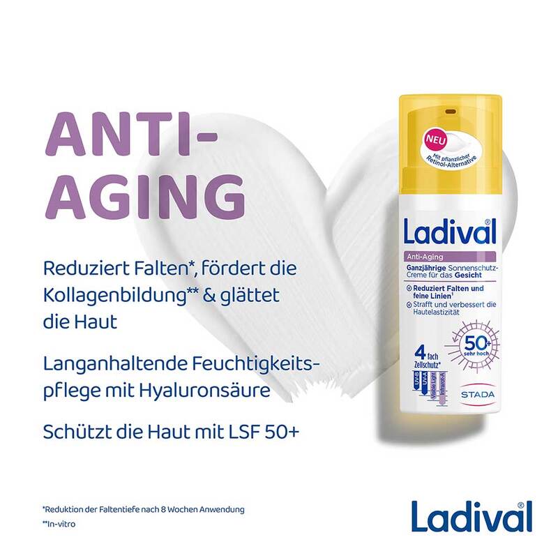 Die Ladival® Anti-Aging Sonnenschutz-Creme LSF 50+ wurde speziell für die anspruchsvolle Gesichtshaut entwickelt, um sichtbaren Zeichen lichtbedingter Hautalterung entgegenzuwirken. Sie reduziert Falten und feine Linien, Sie unterstützt die natürliche Zellerneuerung, fördert die Bildung von Kollagen und verbessert so die Hautelastizität und die Hautfestigkeit.