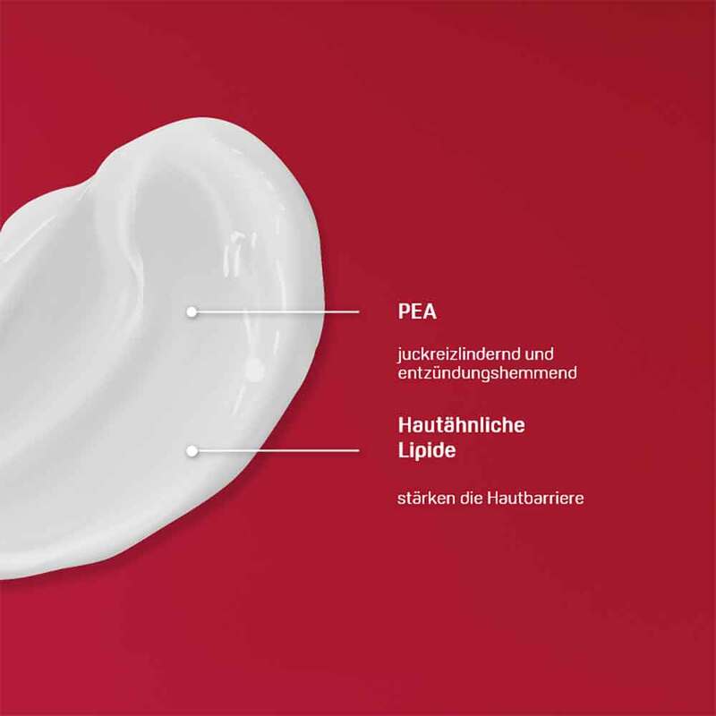 Durch einen hautberuhigenden Wirkkomplex aus hautverwandten Lipiden und Palmitoylethanolamin (PEA) lindert die Creme Juckreiz und Rötungen, zudem wird die Haut natürlich und sanft gepflegt.