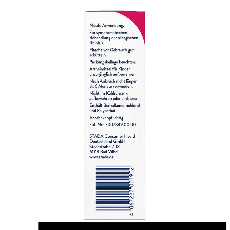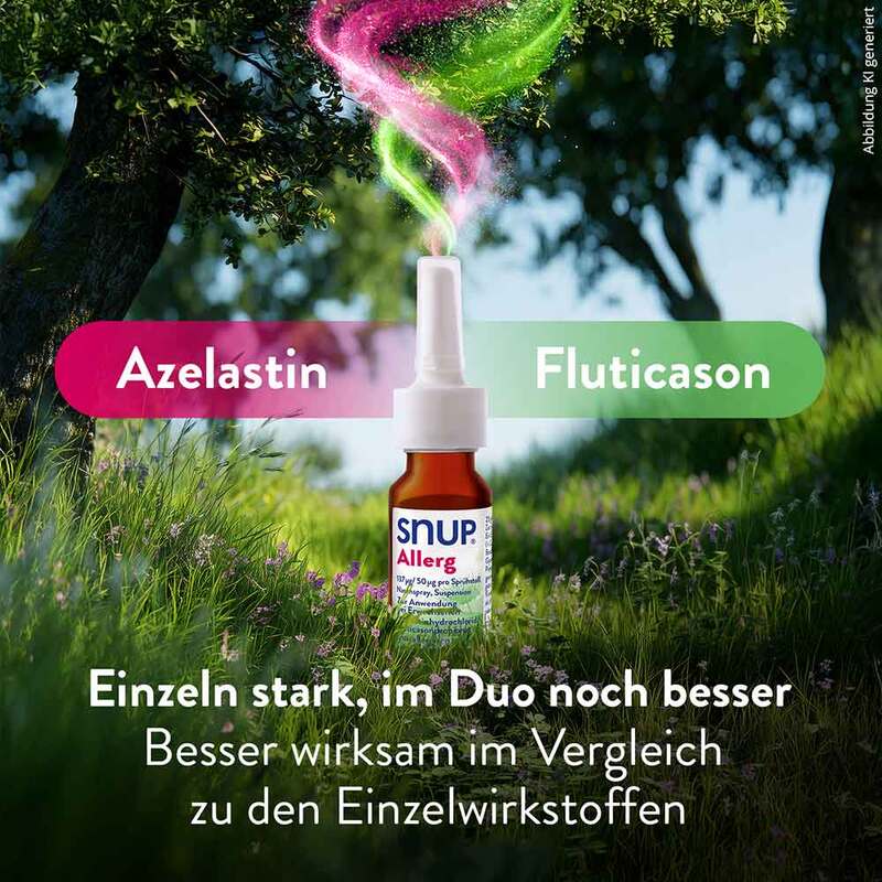 SNUP® Allerg 137 Mikrogramm/50 Mikrogramm pro Sprühstoß Nasenspray, Suspension Zur Anwendung bei Erwachsenen Wirkstoffe: Azelastinhydrochlorid/Fluticasonpropionat. Zur symptomatischen Behandlung der mittelschweren bis schweren saisonalen allergischen Rhinitis (Heuschnupfen) bei Erwachsenen. SNUP® Allerg darf erst angewendet werden, wenn eine mittelschwere bis schwere saisonale allergische Rhinitis von Ihrem Arzt diagnostiziert wurde und wenn die Anwendung von entweder einem nasalen Antihistaminikum oder einem Kortikosteroid allein nicht als ausreichend erachtet wird. Unter saisonaler allergischer Rhinitis versteht man allergische Reaktionen auf Substanzen wie Pollen (Heuschnupfen). SNUP® Allerg lindert die Beschwerden von Allergien, zum Beispiel: laufende Nase, Sekretabfluss aus der Nase in den hinteren Rachenraum, Niesen und juckende oder verstopfte Nase. Hinweis: Enthält Benzalkoniumchlorid und Polysorbat. Zu Risiken und Nebenwirkungen lesen Sie die Packungsbeilage und fragen Sie Ihre Ärztin, Ihren Arzt oder in Ihrer Apotheke. STADA Consumer Health Deutschland GmbH, Stadastraße 2–18, 61118 Bad Vilbel Stand: Mai 2025