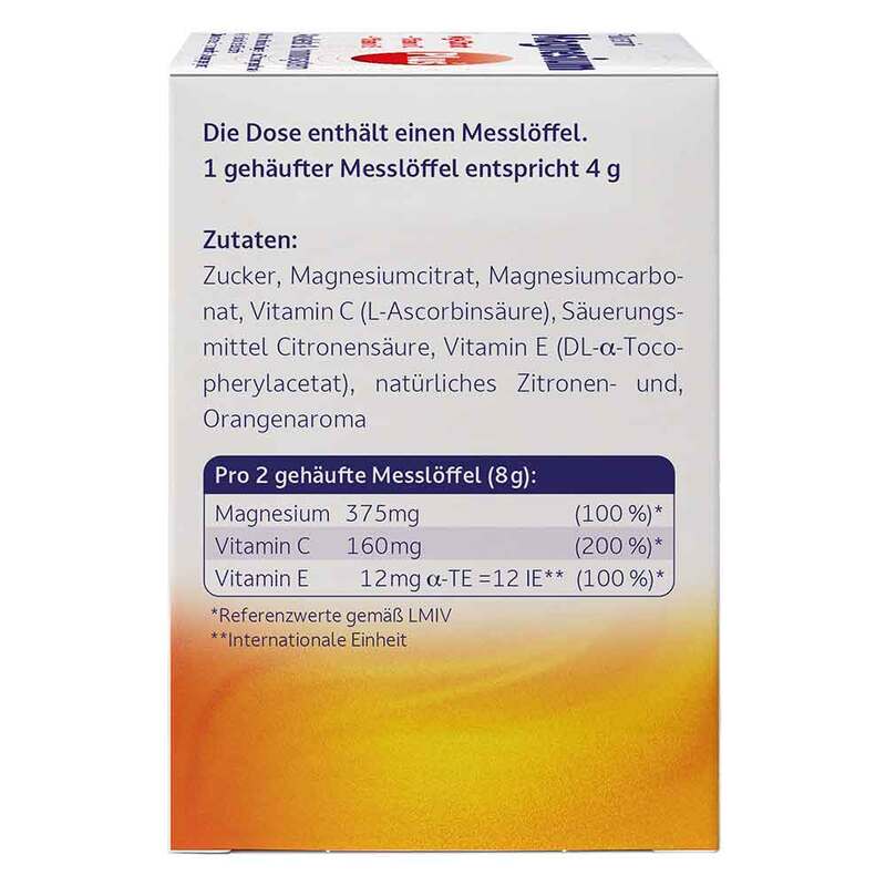 Zucker, Magnesiumcitrat, Magnesiumcarbonat, Vitamin C (L-Ascorbinsäure), Säuerungsmittel Citronensäure, Vitamin E (DL-α-Tocopherylacetat), natürliches Zitronen- und Orangenaroma