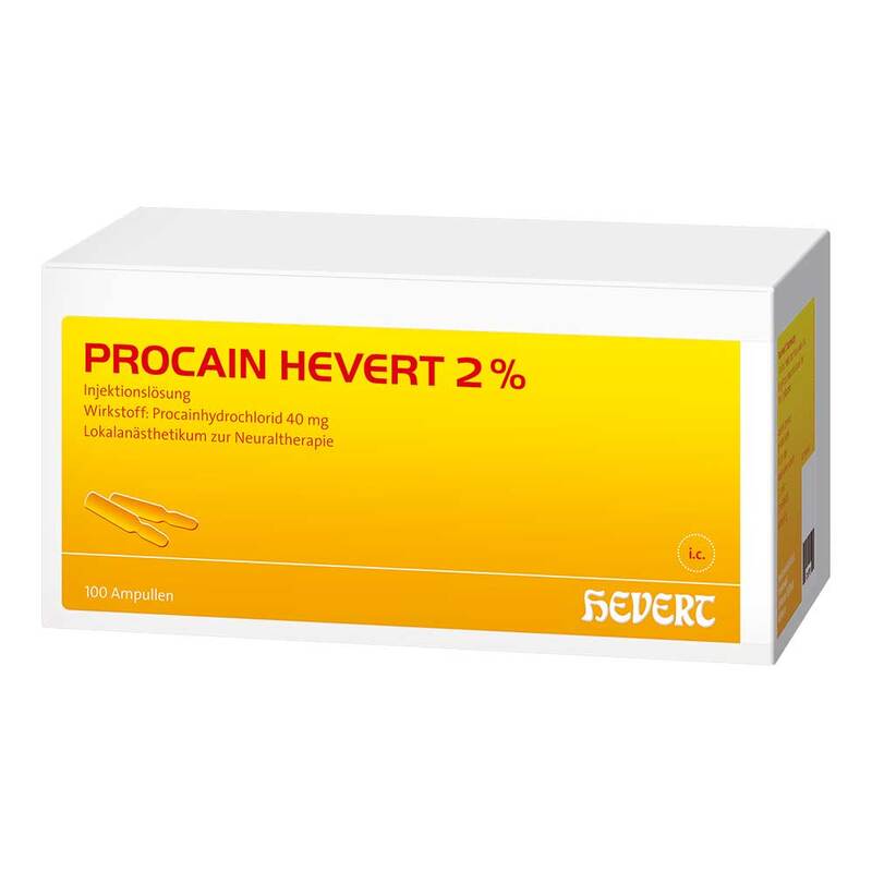 Procain Hevert 2%. Anwendungsgebiete: Zur Anwendung im Rahmen neuraltherapeutischer Anwendungsprinzipien. Zu Risiken und Nebenwirkungen lesen Sie die Packungsbeilage und fragen Sie Ihre Ärztin, Ihren Arzt oder in Ihrer Apotheke.