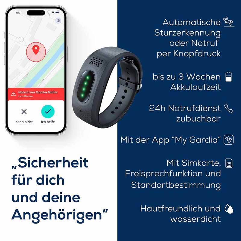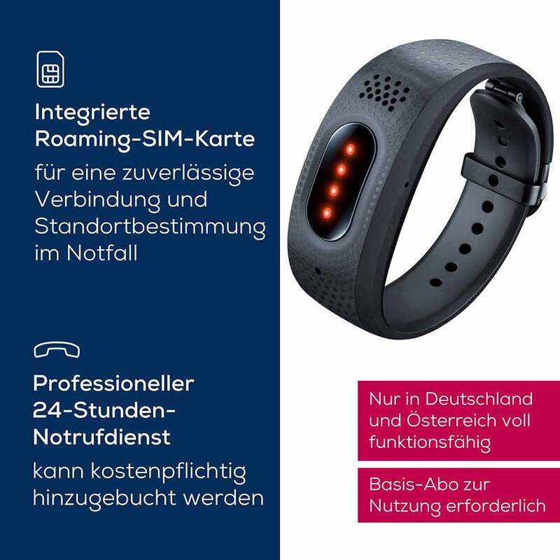 - Sofortige Hilfe auf Knopfdruck: Alarmiert per Tastendruck die 24/7 Notrufzentrale oder Ihre hinterlegten Notfallkontakte - schnell und zuverlässig