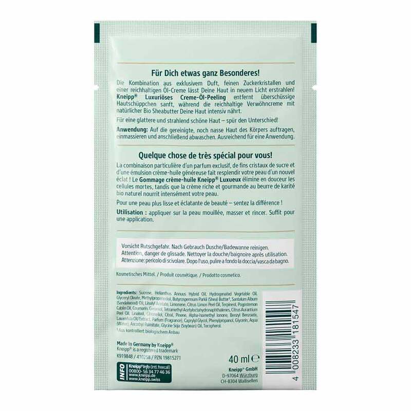 Für Sie etwas ganz Besonderes! Die Kombination aus exklusivem Duft, feinen Zuckerkristallen und einer reichhaltigen Öl-Creme lässt die Haut in neuem Licht erstrahlen! Kneipp Luxuriöses Creme-Öl-Peeling entfernt überschüssige Hautschüppchen sanft, während die reichhaltige Verwöhncreme mit natürlicher Bio Sheabutter Ihre Haut intensiv nährt. Für eine glattere und strahlend schöne Haut spür den Unterschied!