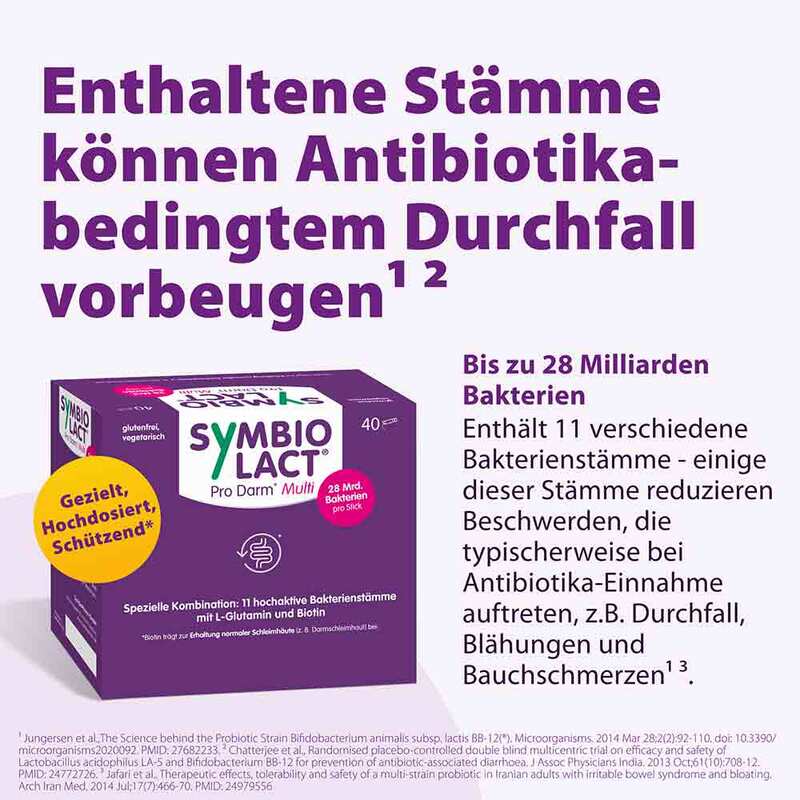 Im Idealfall sollte zwischen der Einnahme eines Antibiotikums und SymbioLact® Pro Darm* Multi ein Abstand von mindestens einer Stunde eingehalten werden.