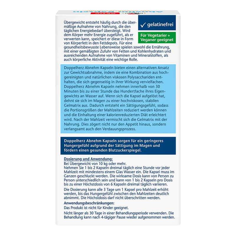 Doppelherz Abnehm Kapseln bieten einen alternativen Ansatz zur Gewichtsabnahme, indem sie eine Kombination aus hochgereinigten und natürlichen viskosen Polysacchariden enthalten, die sich gegenseitig in ihrer Wirkung vervielfachen. Doppelherz Abnehm Kapseln nehmen innerhalb von 30 Minuten bis zu einer Stunde das Hundertfache ihres Eigengewichts an Wasser auf.