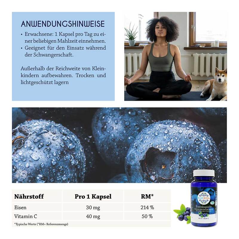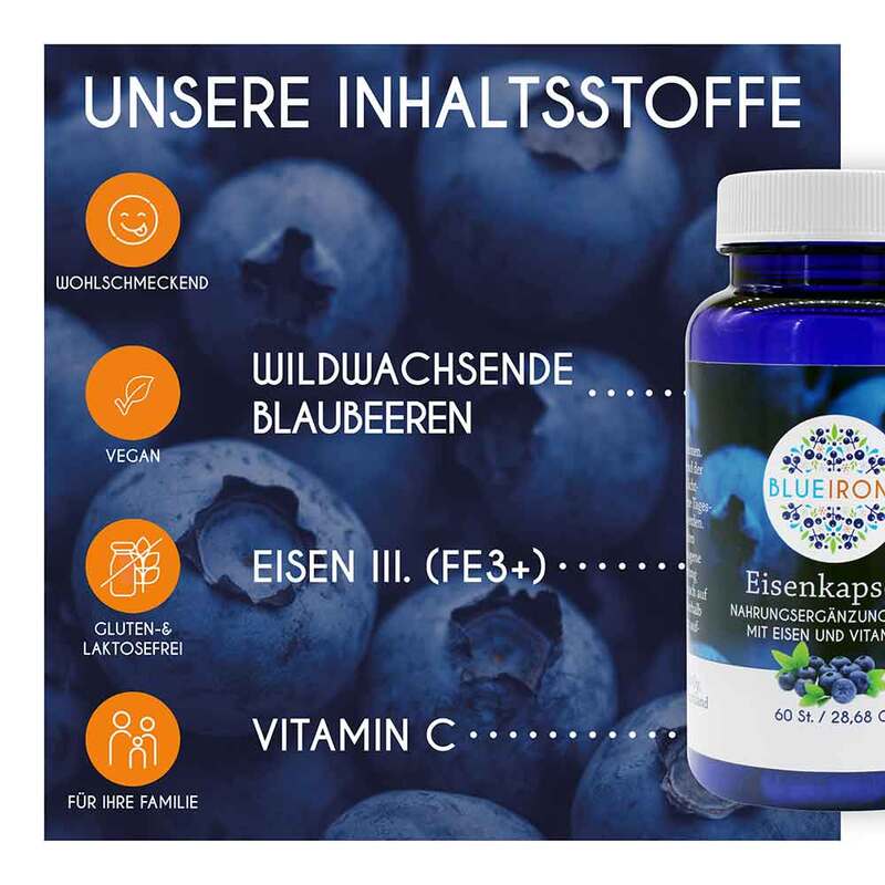 Füllstoff Mikrokristalline Zellulose, Eisensaccharat, Blaubeerpulver (10,5 %), Vitamin C, Trennmittel Magnesiumsalze der Speisefettsäuren, Trennmittel Siliziumdioxid.