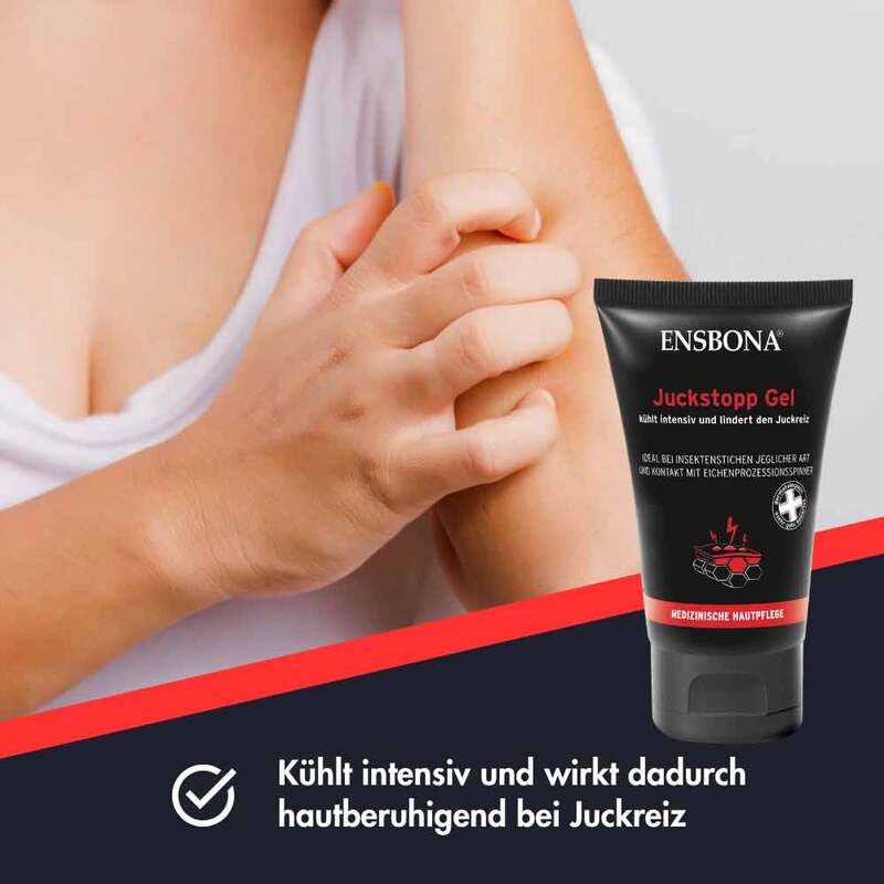 Ensbona Juckstopp Kühlgel lindert akuten Juckreiz bei leichten allergischen Reaktionen sowie einer milden Kontaktdermatitis. Es ist ideal geeignet bei Ausschlägen bedingt durch den Eichenprozessionsspinner oder Insektenstichen. Das Gel kühlt die betroffenen Hautstellen intensiv und wirkt dadurch hautberuhigend bei Juckreiz, Brennen, Rötungen und Schwellungen.