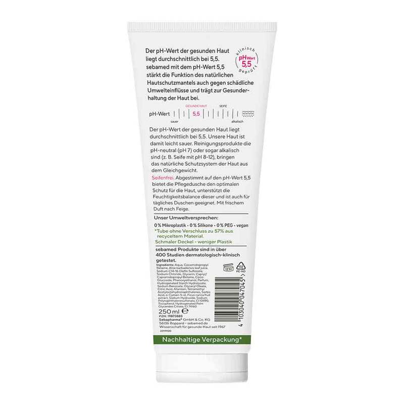 Abgestimmt auf den pH-Wert 5,5 bietet die Sebamed Pflegedusche mit Feige den optimalen Schutz für die Haut, unterstützt die Feuchtigkeitsbalance dieser und ist auch für tägliches Duschen geeignet. Die Pflegedusche ist mit frischem Duft nach Feige.