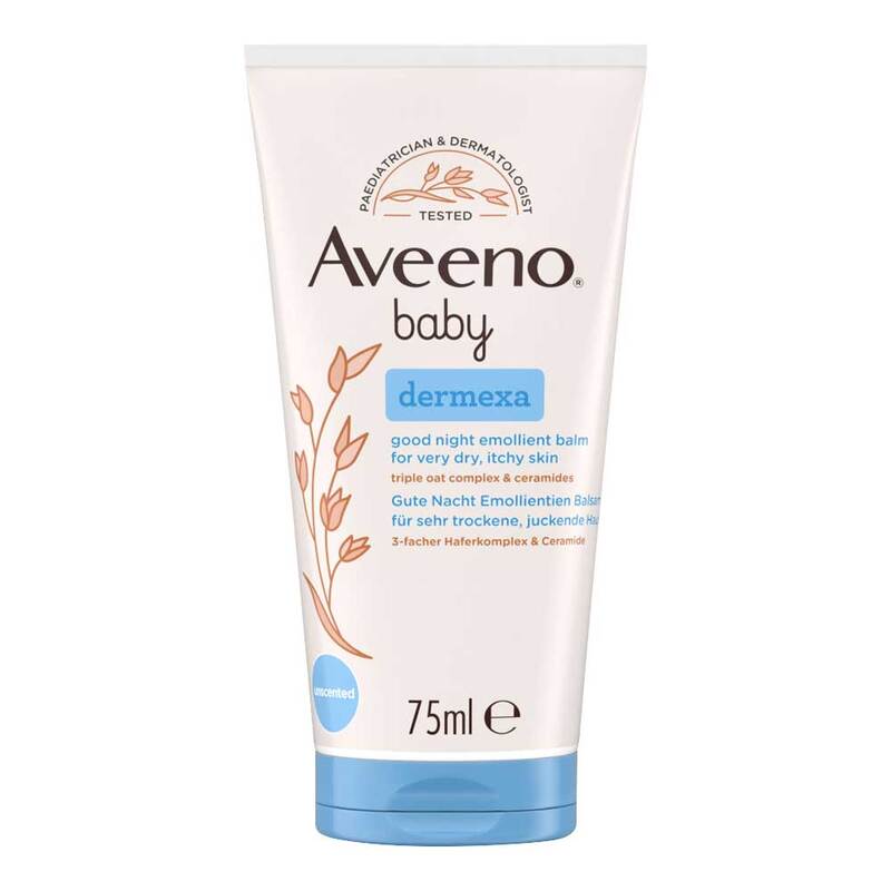Aveeno® baby dermexa Gute Nacht Emollientien Balsam mit dem 3-fachem Haferkomplex & Ceramide beruhigt sehr trockene, juckende Babyhaut & spendet intensive Feuchtigkeit - klinisch erwiesen.