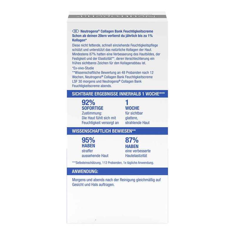 ** wissenschaftliche Bewertung an 48 Probanden nach 12 Wochen, Neutrogena Collagen Bank Feuchtigkeitscreme LSF 30 morgens und Neutrogena Collagen Bank Feuchtigkeitscreme abends.