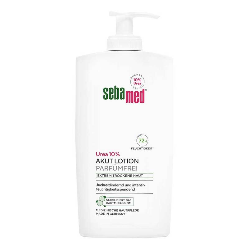 Die parfümfreie sebamed Akut Lotion Urea 10% wurde als Spezialpflege für Personen mit extrem trockener Haut entwickelt. Ihre ausgesuchten Inhaltsstoffe lindern spürbar Spannungsgefühl, Rauheit und Juckreiz bei extrem trockener Haut und helfen, die natürliche Feuchtigkeitsbalance der Haut wieder herzustellen.
