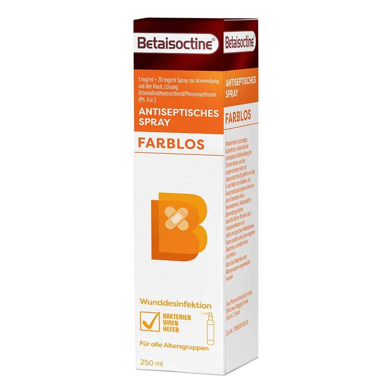 Betaisoctine® 1 mg/ml + 20 mg/ml Spray zur Anwendung auf der Haut, Lösung Wirkstoffe: Octenidindihydrochlorid/Phenoxyethanol. Anwendungsgebiete: Wird zur wiederholten, kurzzeitigen, äußerlichen, vorbereitenden antiseptischen Behandlung der Schleimhäute und der angrenzenden Haut vor diagnostischen Eingriffen an oder in der Nähe der Genital- und Ausscheidungsorgane sowie vor dem Einsetzen eines Harnkatheters verwendet. Wird zur antiseptischen Behandlung kleiner oberflächlicher Wunden und zur Hautdesinfektion vor nicht-chirurgischen Maßnahmen verwendet. Das In-vitro-Wirkungsspektrum von Betaisoctine® umfasst Gram-positive und Gram-negative Bakterien, behüllte Viren sowie Hefen. Betaisoctine® kann bei Patienten aller Altersgruppen angewendet werden. Warnhinweise: Nur für die oberflächliche Anwendung bestimmt und darf nicht in das Gewebe eingeführt werden z. B. mit einer Spritze. Dieses Arzneimittel nicht verwenden, wenn Sie feststellen, dass die Flasche beschädigt ist oder Anzeichen einer Fälschung aufweist. Die Flasche nicht öffnen und nicht die Pumpe abschrauben. Zu Risiken und Nebenwirkungen lesen Sie die Packungsbeilage und fragen Sie Ihre Ärztin, Ihren Arzt oder in Ihrer Apotheke.