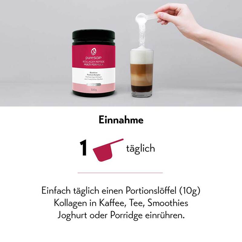 Täglich einen gestrichenen Portionslöffel (= 10 g) in Wasser, Tee, Kaffee, Smoothies oder Suppen einrühren.
